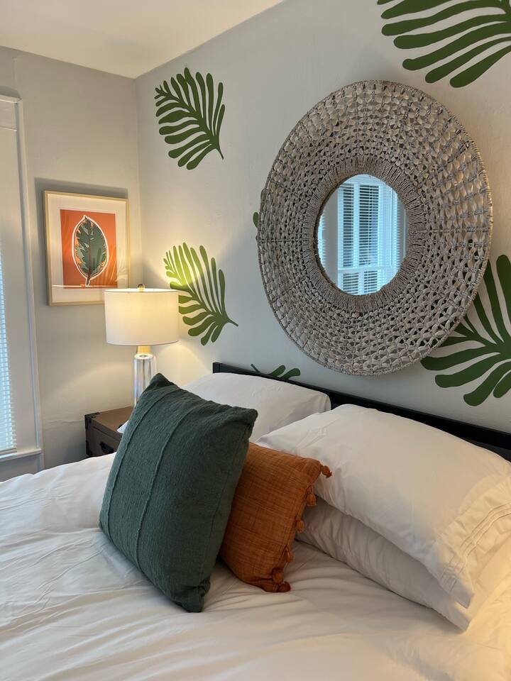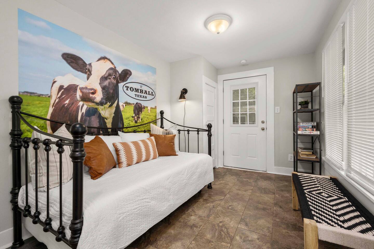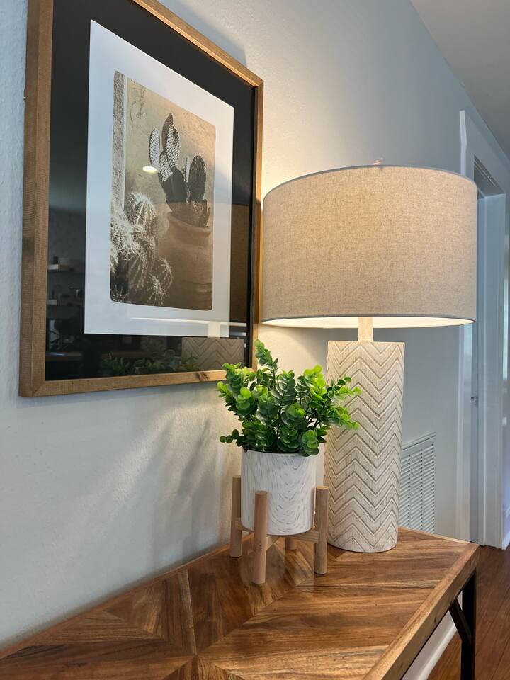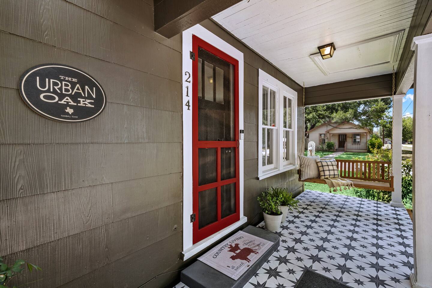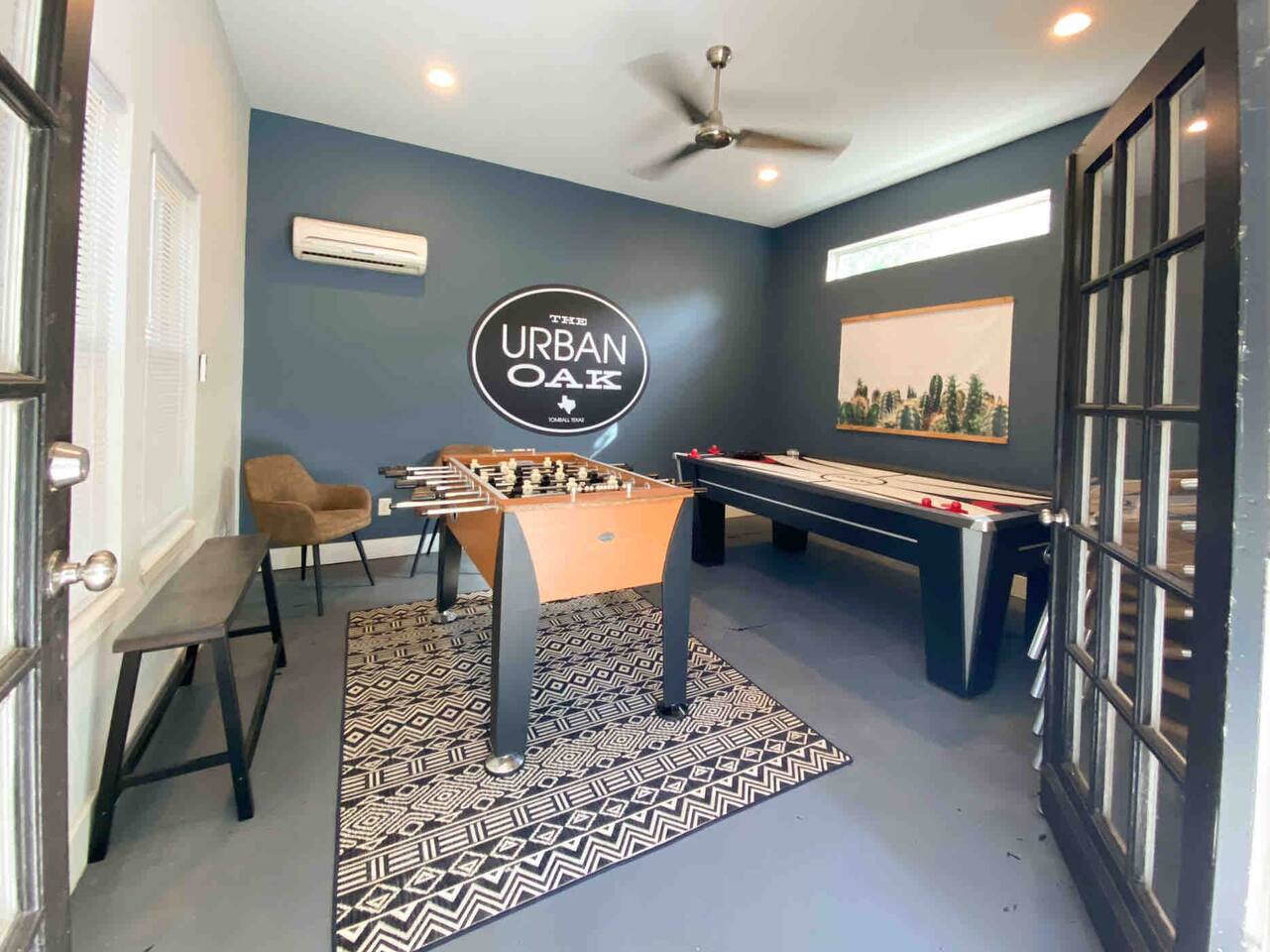 The Urban Oak is an open concept fun mix of Style and Texas. Filled with a lot of character, from the original oak floors to the keyhole doorknobs, mixed with modern amenities. The modern farmhouse kitchen is stocked with everything you will need! Dinnerware, Pots and Pans, Baking sheets, Cutlery, cooking oil, spices, instapot, crockpot, toaster, blender, electric kettle, gas stove, microwave, wine glasses, Cork screw and more. The home features 3 Roku smart TVs. A 50 inch in the Living room, and a 43 inch in the "Rustic Retreat" bedroom and a 43 inch in the "Palm" bedroom. The Urban Oak is not far from Houston, The Woodlands and the Texas Renaissance Festival. The Bedrooms: THE RUSTIC RETREAT BEDROOM This room features a king size bed, 43 inch TV, Small sofa, full length dressing mirror and a workspace. The on-suite bathroom feature a large subway tiled shower with rain head & hand sprayer options. The farmhouse style vanity featuring a 100 year old ship lap wall is sure to be a favorite. THE PALM BEDROOM With a touch of boho styling, the hand painted palm leaves surrounding the queen size bed helps make this room a peaceful space. Space includes a dresser, full length dressing mirror and a 43 inch TV THE CACTUS ROOM Hand Painted Mural surrounds this room with a little taste of West Texas! The room features a double bed with lots of color and style. THE COW SUNROOM /BEDROOM Great place to sleep day or night. This room has a twin day bed with a pull out twin trundle. Great for resting, or reading a book, during the day and sleeping at night. Take your Tomball Selfies here with Bessie the Cow. This space also has lots of board games and a game table. THE GAME ROOM Enjoy a game of foosball or air hockey in our backyard game room connected to our outdoor hangout space. Or try your skills a game of backyard cornhole!