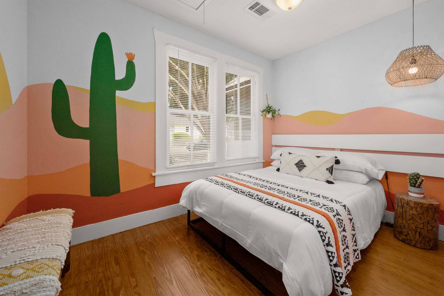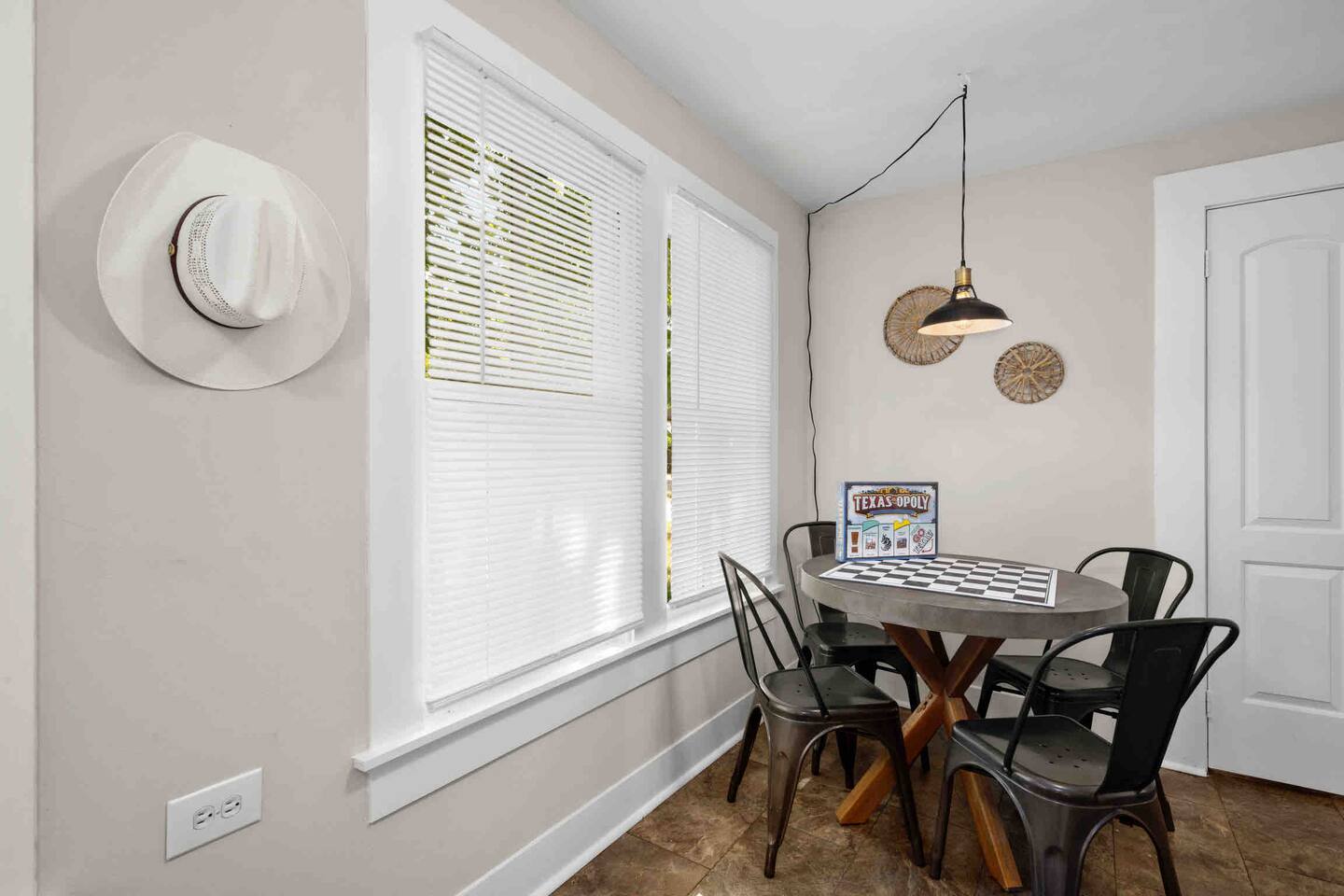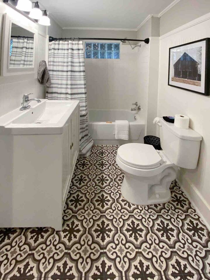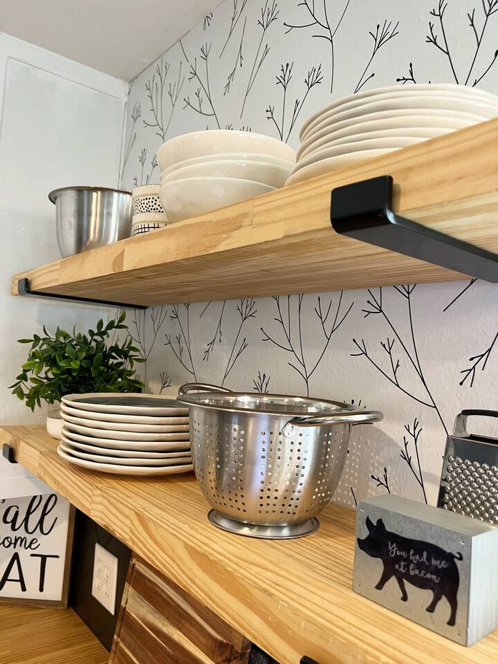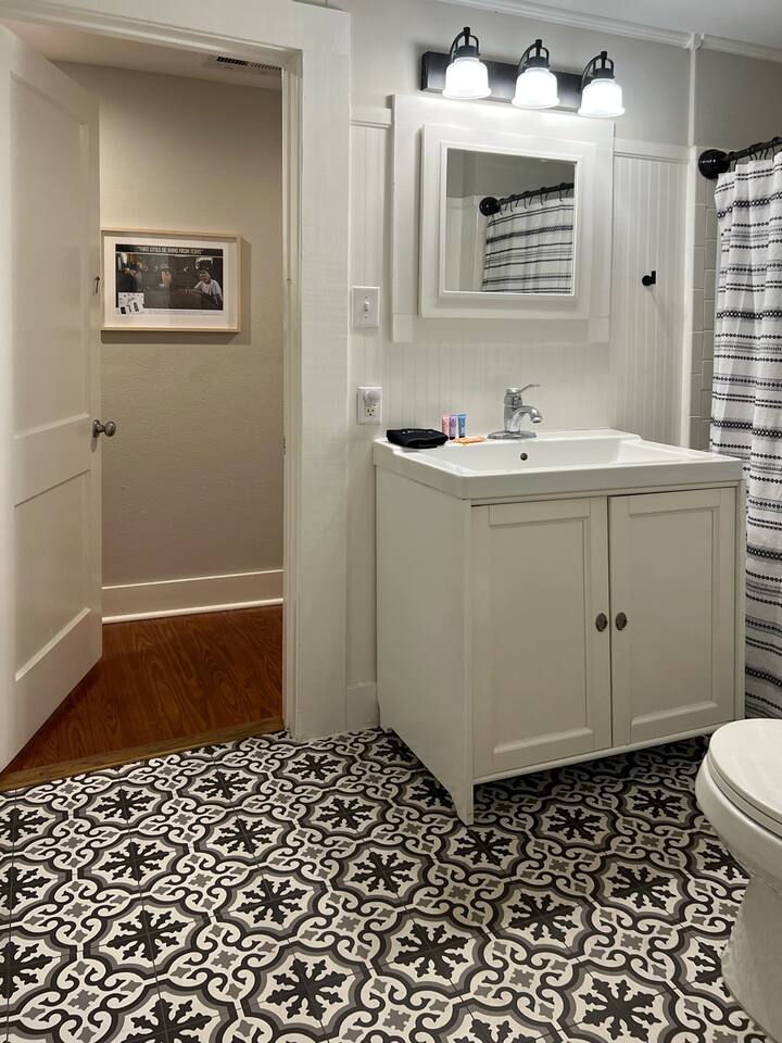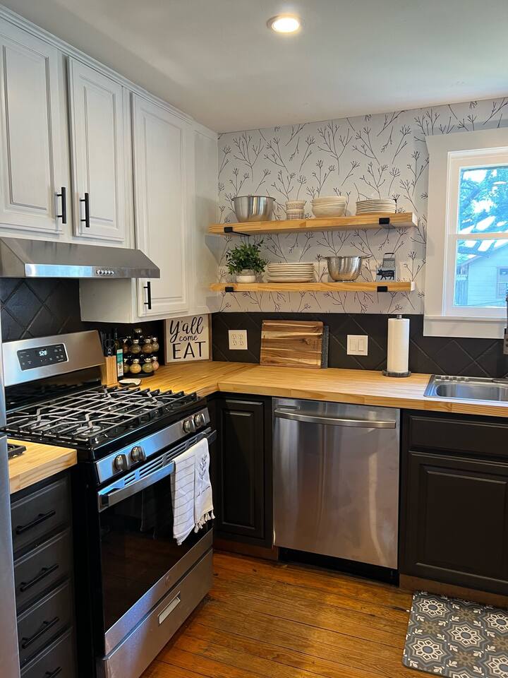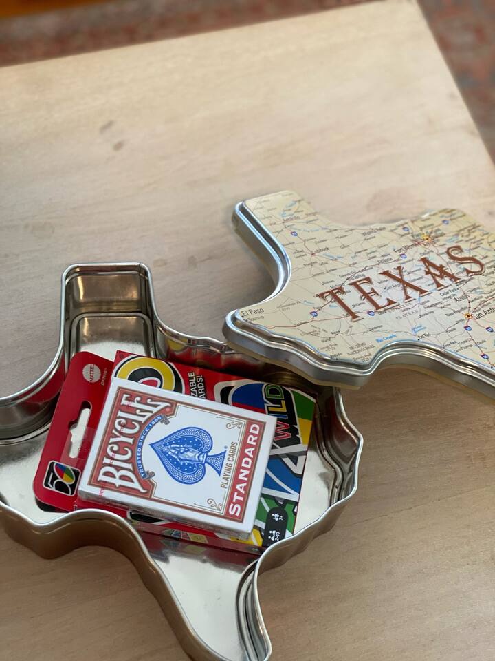 The Urban Oak is an open concept fun mix of Style and Texas. Filled with a lot of character, from the original oak floors to the keyhole doorknobs, mixed with modern amenities. The modern farmhouse kitchen is stocked with everything you will need! Dinnerware, Pots and Pans, Baking sheets, Cutlery, cooking oil, spices, instapot, crockpot, toaster, blender, electric kettle, gas stove, microwave, wine glasses, Cork screw and more. The home features 3 Roku smart TVs. A 50 inch in the Living room, and a 43 inch in the "Rustic Retreat" bedroom and a 43 inch in the "Palm" bedroom. The Urban Oak is not far from Houston, The Woodlands and the Texas Renaissance Festival. The Bedrooms: THE RUSTIC RETREAT BEDROOM This room features a king size bed, 43 inch TV, Small sofa, full length dressing mirror and a workspace. The on-suite bathroom feature a large subway tiled shower with rain head & hand sprayer options. The farmhouse style vanity featuring a 100 year old ship lap wall is sure to be a favorite. THE PALM BEDROOM With a touch of boho styling, the hand painted palm leaves surrounding the queen size bed helps make this room a peaceful space. Space includes a dresser, full length dressing mirror and a 43 inch TV THE CACTUS ROOM Hand Painted Mural surrounds this room with a little taste of West Texas! The room features a double bed with lots of color and style. THE COW SUNROOM /BEDROOM Great place to sleep day or night. This room has a twin day bed with a pull out twin trundle. Great for resting, or reading a book, during the day and sleeping at night. Take your Tomball Selfies here with Bessie the Cow. This space also has lots of board games and a game table. THE GAME ROOM Enjoy a game of foosball or air hockey in our backyard game room connected to our outdoor hangout space. Or try your skills a game of backyard cornhole!