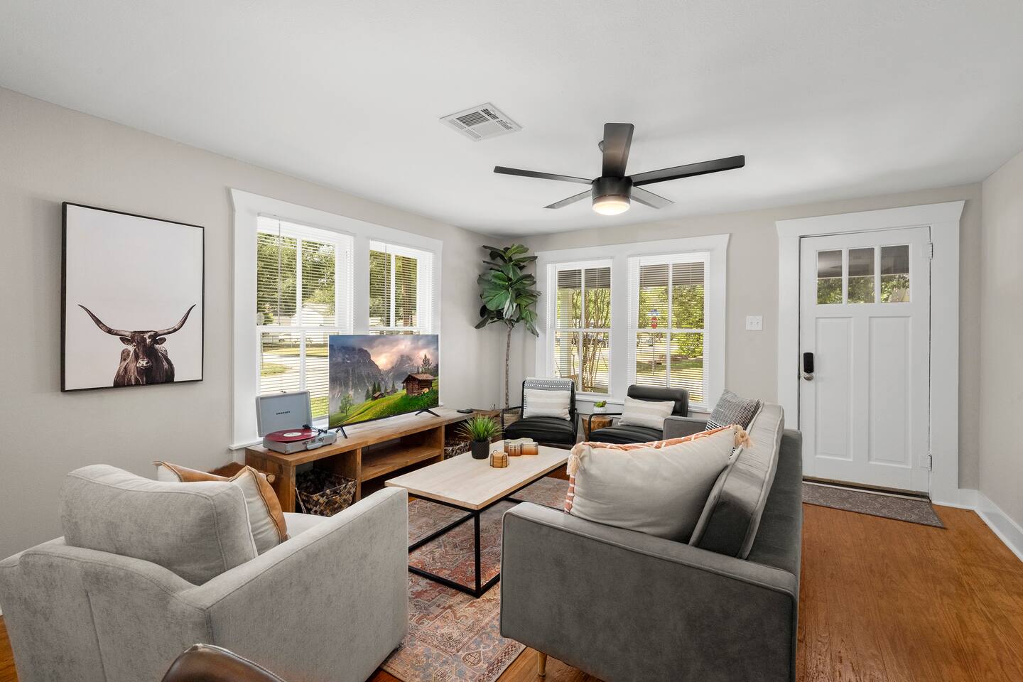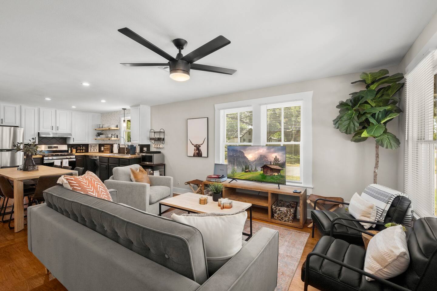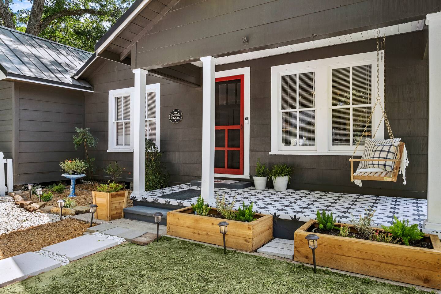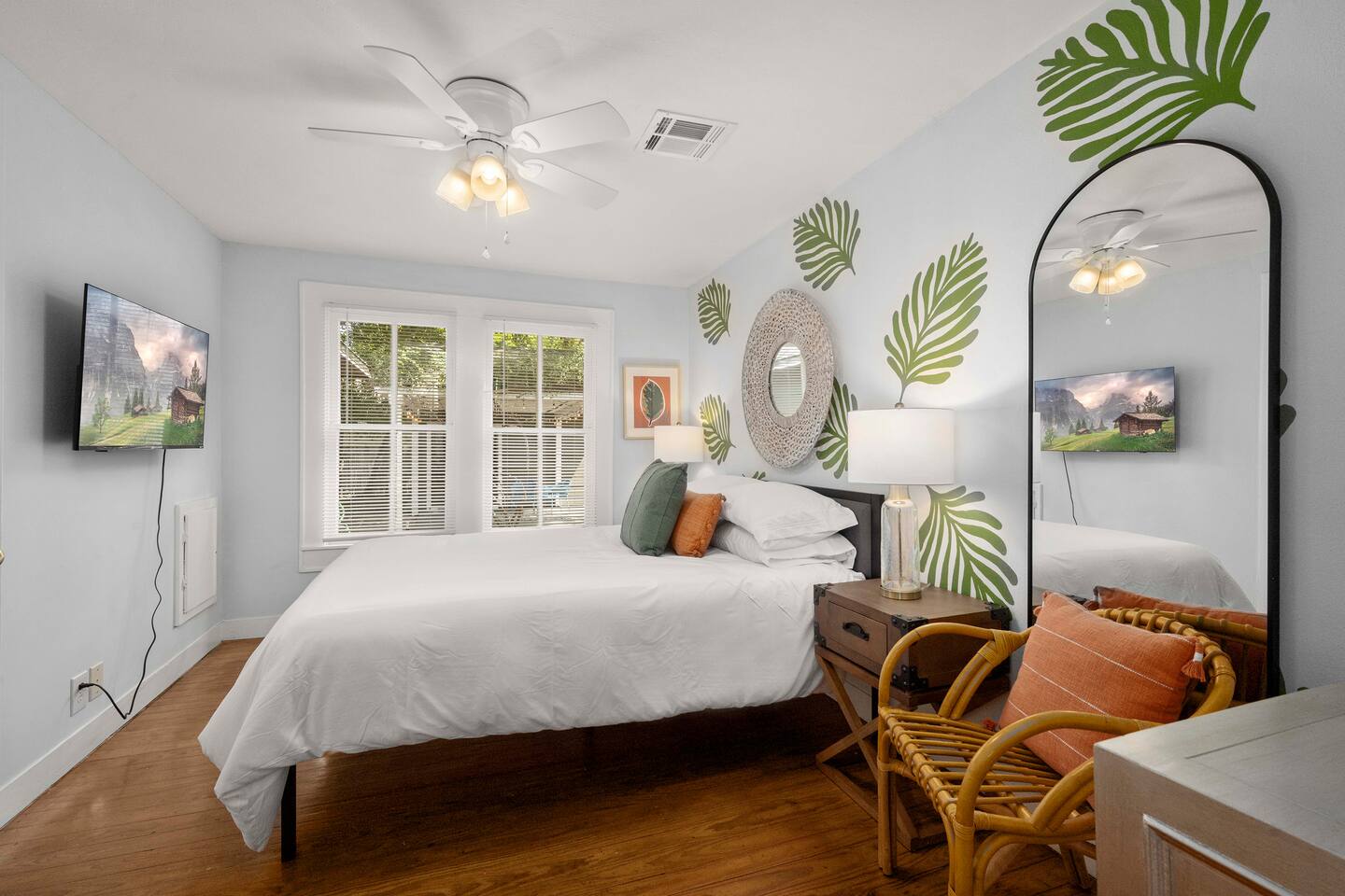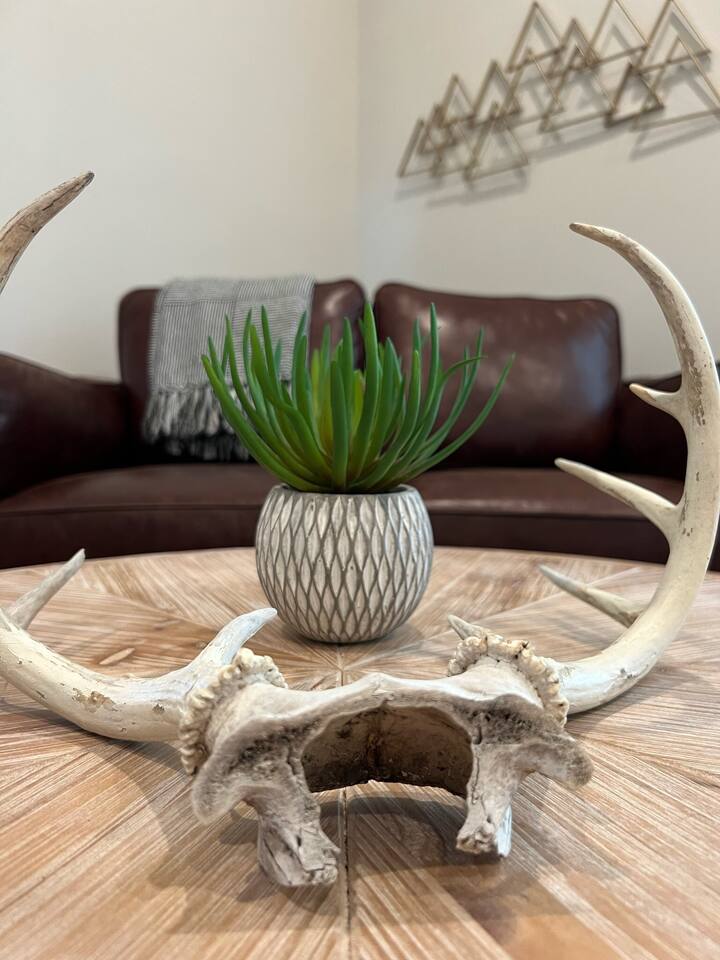 The Urban Oak is an open concept fun mix of Style and Texas. Filled with a lot of character, from the original oak floors to the keyhole doorknobs, mixed with modern amenities. The modern farmhouse kitchen is stocked with everything you will need! Dinnerware, Pots and Pans, Baking sheets, Cutlery, cooking oil, spices, instapot, crockpot, toaster, blender, electric kettle, gas stove, microwave, wine glasses, Cork screw and more. The home features 3 Roku smart TVs. A 50 inch in the Living room, and a 43 inch in the "Rustic Retreat" bedroom and a 43 inch in the "Palm" bedroom. The Urban Oak is not far from Houston, The Woodlands and the Texas Renaissance Festival. The Bedrooms: THE RUSTIC RETREAT BEDROOM This room features a king size bed, 43 inch TV, Small sofa, full length dressing mirror and a workspace. The on-suite bathroom feature a large subway tiled shower with rain head & hand sprayer options. The farmhouse style vanity featuring a 100 year old ship lap wall is sure to be a favorite. THE PALM BEDROOM With a touch of boho styling, the hand painted palm leaves surrounding the queen size bed helps make this room a peaceful space. Space includes a dresser, full length dressing mirror and a 43 inch TV THE CACTUS ROOM Hand Painted Mural surrounds this room with a little taste of West Texas! The room features a double bed with lots of color and style. THE COW SUNROOM /BEDROOM Great place to sleep day or night. This room has a twin day bed with a pull out twin trundle. Great for resting, or reading a book, during the day and sleeping at night. Take your Tomball Selfies here with Bessie the Cow. This space also has lots of board games and a game table. THE GAME ROOM Enjoy a game of foosball or air hockey in our backyard game room connected to our outdoor hangout space. Or try your skills a game of backyard cornhole!