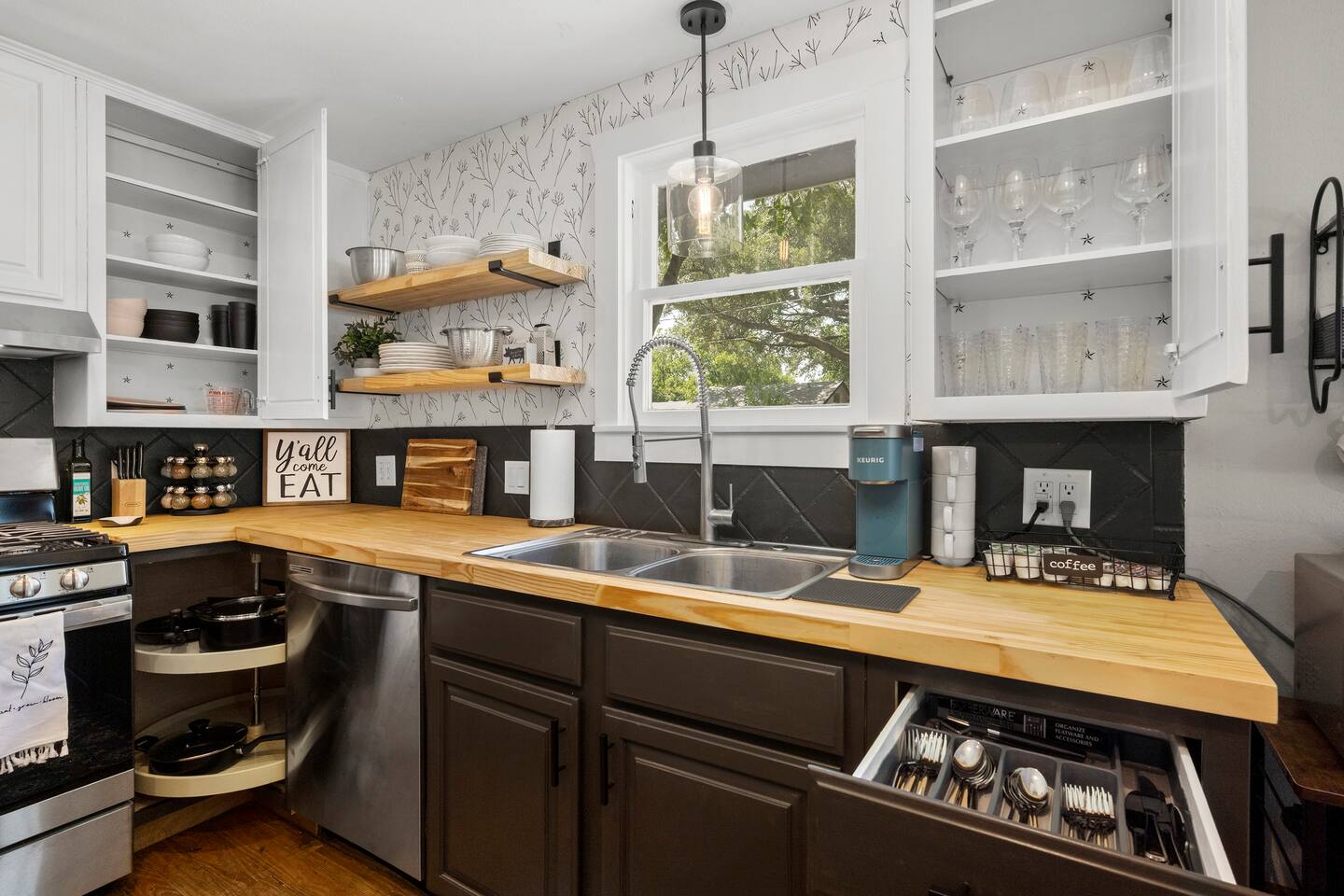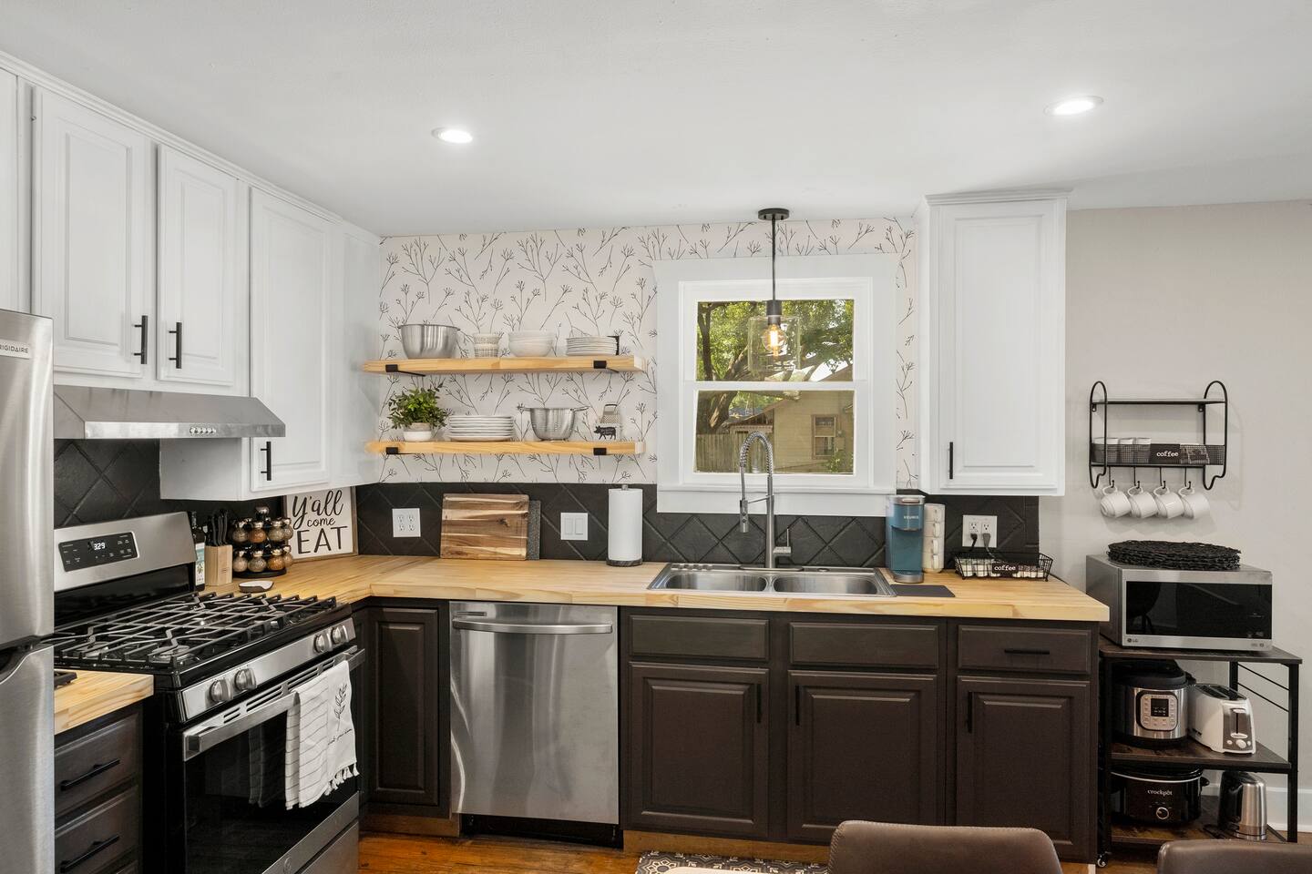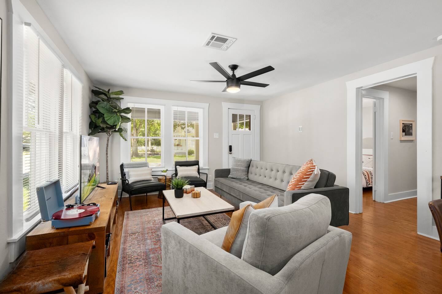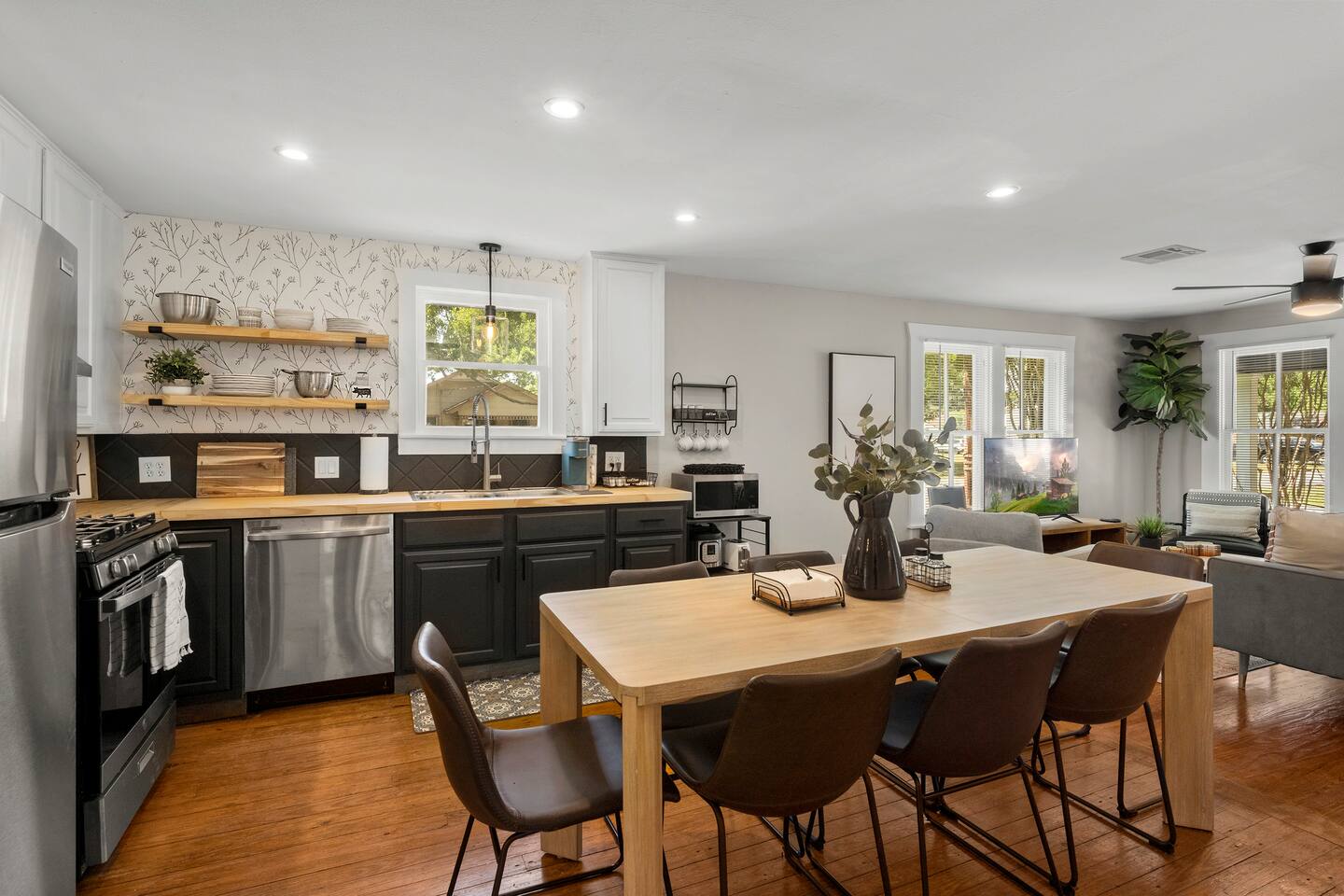 The Urban Oak is an open concept fun mix of Style and Texas. Filled with a lot of character, from the original oak floors to the keyhole doorknobs, mixed with modern amenities. The modern farmhouse kitchen is stocked with everything you will need! Dinnerware, Pots and Pans, Baking sheets, Cutlery, cooking oil, spices, instapot, crockpot, toaster, blender, electric kettle, gas stove, microwave, wine glasses, Cork screw and more. The home features 3 Roku smart TVs. A 50 inch in the Living room, and a 43 inch in the "Rustic Retreat" bedroom and a 43 inch in the "Palm" bedroom. The Urban Oak is not far from Houston, The Woodlands and the Texas Renaissance Festival. The Bedrooms: THE RUSTIC RETREAT BEDROOM This room features a king size bed, 43 inch TV, Small sofa, full length dressing mirror and a workspace. The on-suite bathroom feature a large subway tiled shower with rain head & hand sprayer options. The farmhouse style vanity featuring a 100 year old ship lap wall is sure to be a favorite. THE PALM BEDROOM With a touch of boho styling, the hand painted palm leaves surrounding the queen size bed helps make this room a peaceful space. Space includes a dresser, full length dressing mirror and a 43 inch TV THE CACTUS ROOM Hand Painted Mural surrounds this room with a little taste of West Texas! The room features a double bed with lots of color and style. THE COW SUNROOM /BEDROOM Great place to sleep day or night. This room has a twin day bed with a pull out twin trundle. Great for resting, or reading a book, during the day and sleeping at night. Take your Tomball Selfies here with Bessie the Cow. This space also has lots of board games and a game table. THE GAME ROOM Enjoy a game of foosball or air hockey in our backyard game room connected to our outdoor hangout space. Or try your skills a game of backyard cornhole!